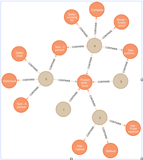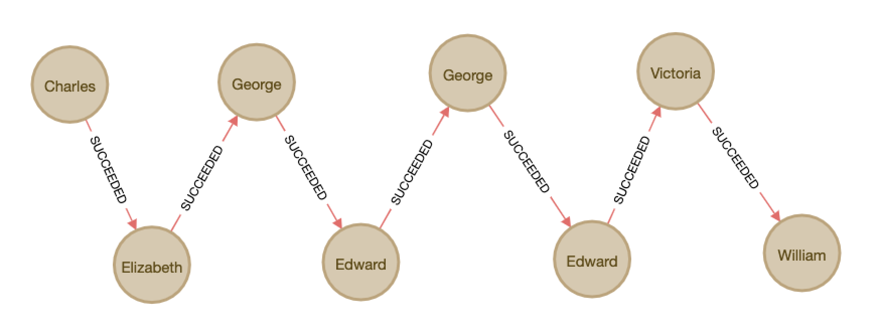 We can also select a series of nodes in a chain, and in the following example the first to third are selected by specifying *1..3 in the relationship pattern.