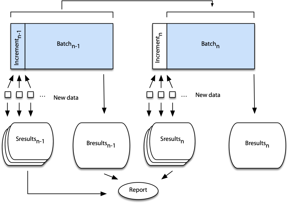 A current report can be created by combining speed layer and batch layer results (i.e., Sresultsn-1 and Bresultsn-1).