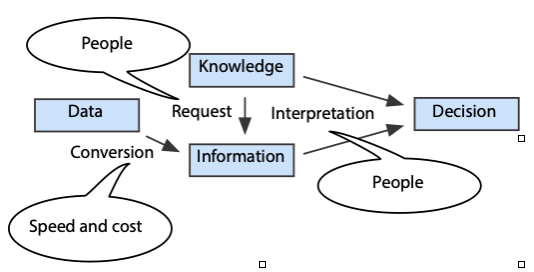 In a highly connected and competitive world, speedy high quality decisions can be a competitive advantage. However, large data sets can take some time and expense to process, and so as more data are collected, there is a the danger that decision making will gradually slow down and its quality lowered. Data analytics becomes a bottleneck when the conversion of data to information is too slow. Second, decision quality is lowered when there is a dearth of skills for determining what data should be converted to information and interpreting the resulting conversion. We capture these problems in the elaboration of a diagram that was introduced in Chapter 1, which now illustrates the causes of the conversion, request, and interpretation bottlenecks.