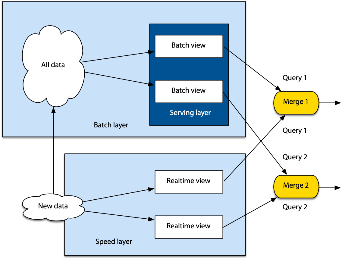 In summary, the batch layer pre-computes reports using all the currently available data. The serving layer indexes the results of the batch layers and creates views that are the foundation for rapid responses to queries. The speed layer does incremental updates as data are received. Queries are handled by merging data from the serving and speed layers.