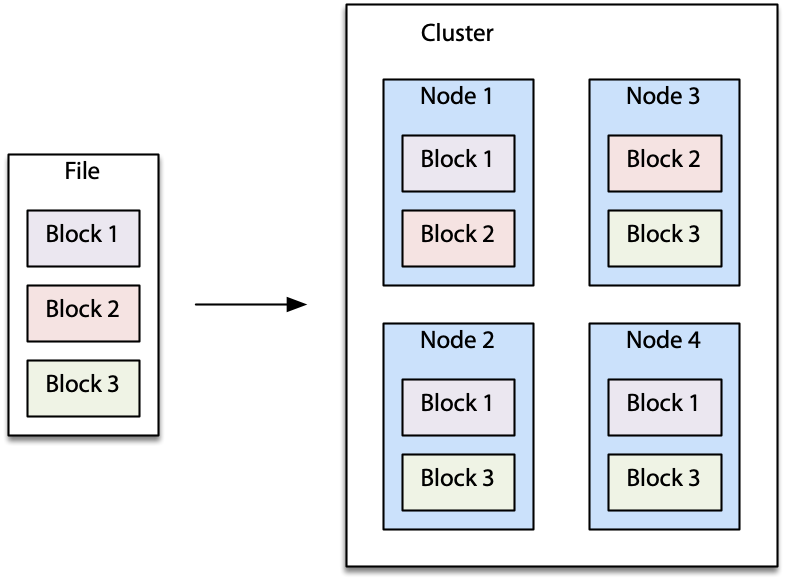 HDFS is a highly scalable, fault-toleration, distributed file system. When a file is uploaded to HDFS, it is split into fixed sized blocks of at least 64MB. Blocks are replicated across nodes to support parallel processing and provide fault tolerance. As the following diagram illustrates, an original file when written to HDFS is broken into multiple large blocks that are spread across multiple nodes. HDFS provides a set of functions for converting a file to and from HDFS format and handling HDFS.