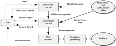 Two DBMS functions, access control and encryption, are the primary mechanisms for ensuring that the data are accessed only by authorized persons. Access control consists of identification and authorization. Data access authorization is the process of permitting users whose identities have been authenticated to perform certain operations on certain data objects. Encrypted data cannot be read by an intruder unless that person knows the method of encryption and has the key. In a DBMS environment, encryption can be applied to data sent over communication lines between computers and data storage devices.