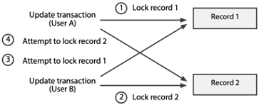 Resource locking solves some data and retrieval integrity problems, but it may lead to another problem, referred to as deadlock or the deadly embrace. Deadlock is an impasse that occurs because two applications lock certain resources, then request resources locked by each other. The following figure illustrates a deadlock situation. Both transactions require records 1 and 2. Transaction A first accesses record 1 and locks it. Then transaction B accesses record 2 and locks it. Next, B’s attempt to access record 1 is denied, so the application waits for the record to be released. Finally, A’s attempt to access record 2 is denied, so the application waits for the record to be released. Thus, application A’s update transaction is waiting for record 2 (locked by application B), and application B is waiting for record 1 (locked by application A). Unless the DBMS intervenes, both applications will wait indefinitely.