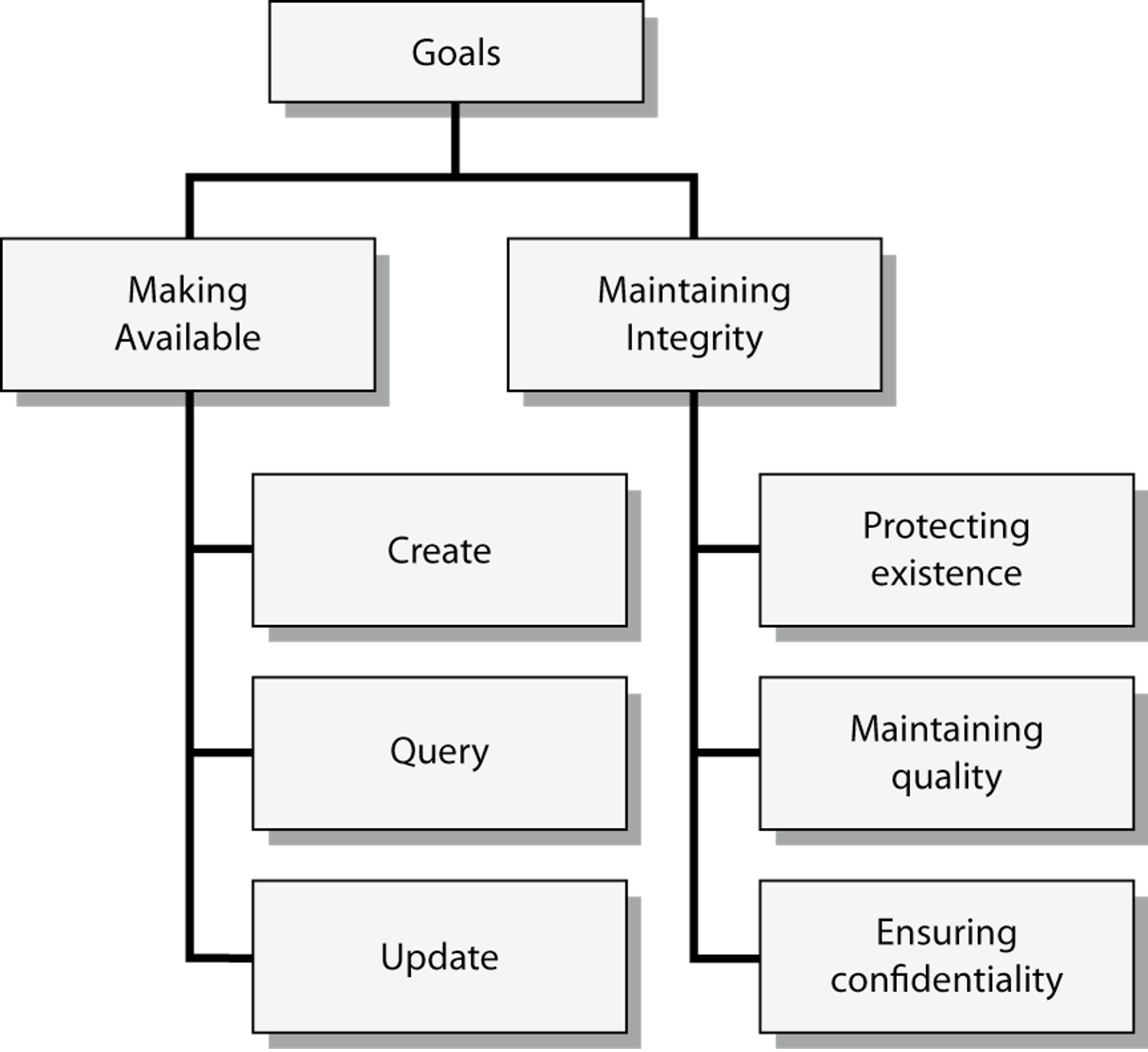 The management of data is driven by two goals: availability and integrity. Availability deals with making data available to whomever needs it, whenever and wherever he or she needs it, and in a meaningful form. As illustrated in following figure, availability concerns the creation, interrogation, and update of data stores. Although most of the book, thus far, has dealt with making data available, a database is of little use to anyone unless it has integrity. Maintaining data integrity implies three goals:90