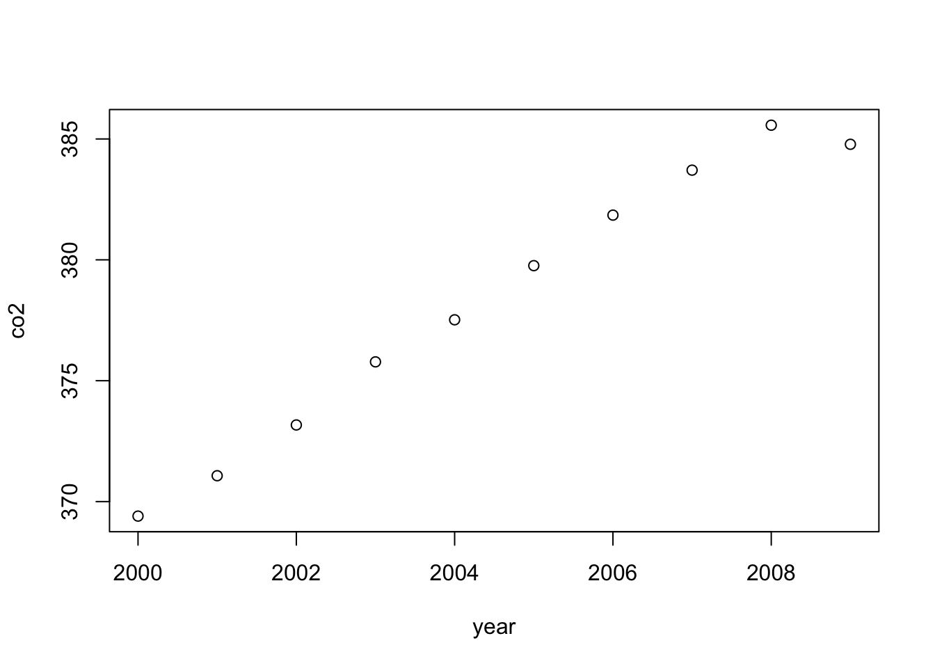 co2## [1] 369.40 371.07 373.17 375.78 377.52 379.76 381.85 383.71 385.57 384.78