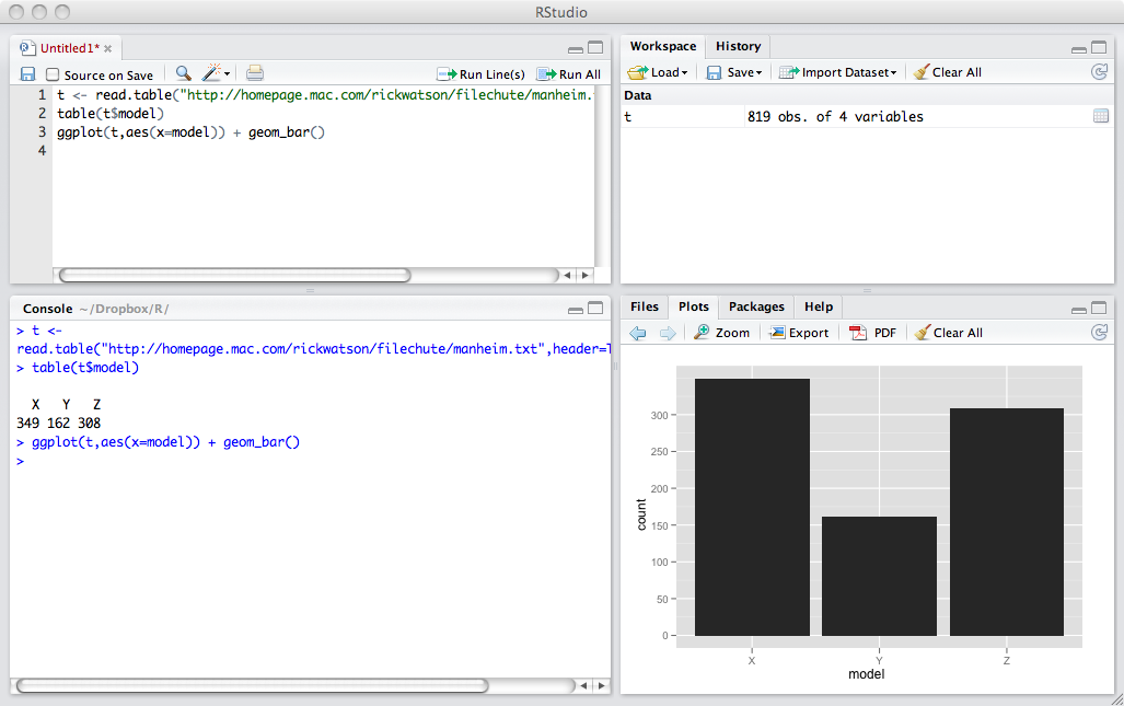 RStudio is a commonly used integrated development environment (IDE) for R. It contains four windows. The upper-left window contains scripts, one or more lines of R code that constitute a task. Scripts can be saved and reused. It is good practice to save scripts as you will find you can often edit an existing script to meet the needs of a new task. The upper-right window provides details of all datasets created. It also useful for importing datasets and reviewing the history of R commands executed. The lower-left window displays the results of executed scripts. If you want to clear this window, then press control-L. The lower-right window can be used to show files on your system, plots you have created by executing a script, packages installed and loaded, and help information.
