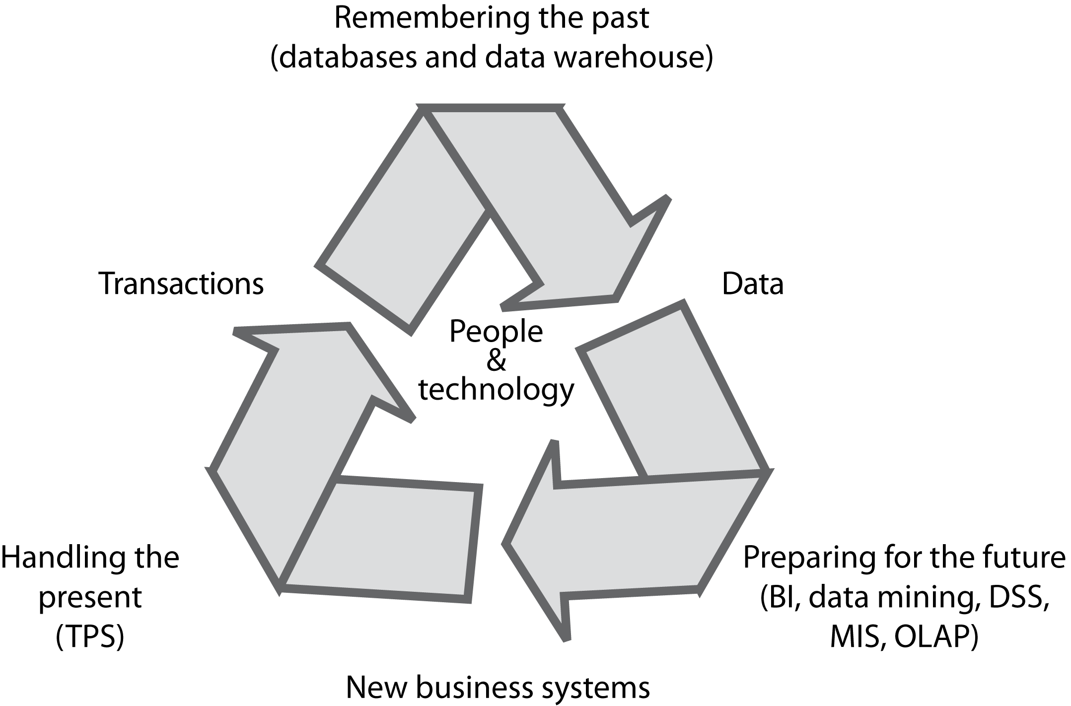 The various systems and technologies found in an organization are linked in a cycle. The routine ongoing business of the organization is processed by TPSs, the systems that handle the present. Data collected by TPSs are stored in databases, a record of the past, the history of the organization and its interaction with those with whom it conducts business. These data are converted into information by analysts using a variety of software (e.g., a DSS). These technologies are used by the organization to prepare for the future (e.g., sales in Finland have expanded, so we will build a new service center in Helsinki). The business systems created to prepare for the future determine the transactions the company will process and the data that will be collected, and the process continues. The entire cycle is driven by people using technology (e.g., a customer booking a hotel room via a Web browser).