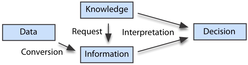The relationship between data, information, and knowledge is depicted in the following figure. A knowledgeable person requests information to support decision making. To fulfill the request, data are converted into information. Personal knowledge is then applied to interpret the requested information and reach a conclusion. Of course, the cycle can be repeated several times if more information is needed before a decision can be made. Notice how knowledge is essential for grasping what information to request and interpreting that information in terms of the required decision.