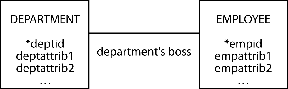 A 1:1 relationship sometimes occurs in parallel with a 1:m relationship between two entities. It signifies some instances of an entity that have an additional role. For example, a department has many employees (the 1:m relationship), and a department has one boss (the 1:1). The data model fragment shown in the following figure represents the 1:1 relationship.