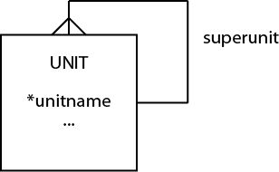 A more general approach to modeling a tree structure is to recognize that it is a series of 1:m recursive relationships. Thus, it can be modeled as follows. This model is identical in structure to that of recursive 1:m reviewed earlier in this chapter and converted to a table in the same manner. Notice that we label the relationship superunit, and this would be a good choice of name for the foreign key.