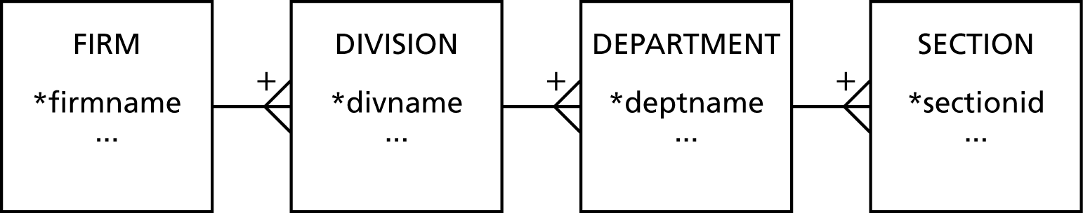 The interesting feature of the following figure is the primary key. Notice that the primary key of a lower level of the tree is a composite of its partial identifier and the primary key of the immediate higher level. The primary key of department is a composite of deptname, divname, and firmname. Novice modelers often forget to make this translation.