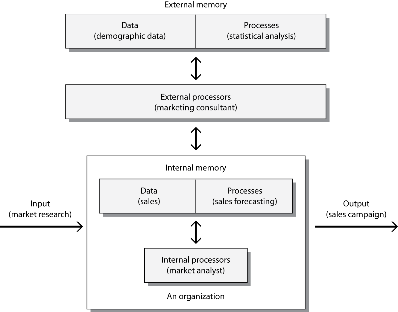This model of augmented human information processing translates directly to an organizational setting. Organizations collect inputs from the environment: market research, customer complaints, and competitor actions. They process these data and produce outputs: sales campaigns, new products, price changes, and so on. The following figure gives an example of how an organization might process data. As a result of some market research (input), a marketing analyst (an internal processor) retrieves sales data (data) and does a sales forecast (process). The analyst also requests a marketing consultant (an external processor) to analyze (process) some demographic reports (data) before deciding to launch a new sales campaign (output).