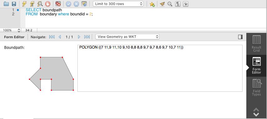 INSERT INTO city VALUES ('Londonderry',ST_GeomFROMText('POINT(7 10)', 0),'ni');The two sets of values for the column boundary define the boundaries