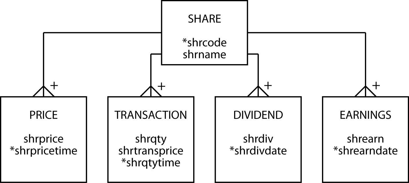 If we take the SHARE entity introduced very early in your data modeling experience, we can add temporal information to record the history of all values that are time-varying (i.e., price, quantity, dividend, and earnings). The data model to record temporal data is displayed. Firms pay dividends and report earnings only a few times per year, so we can associate a date with each value of dividend and earnings. Recording the history of trading transactions requires a timestamp, because a person can make multiple trades in a day. Every time a share is bought or sold, a new row is inserted containing both the transaction quantity and price. The number owned can be derived by using SUM.