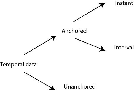 SQL supports several different data types for storing numeric values (e.g., integer and float), and a temporal database also needs a variety of data types for storing time values. The first level of distinction is to determine whether the time value is anchored or unanchored. Anchored time has a defined starting point (e.g., October 15, 1582), and unanchored time is a block of time with no specified start (e.g., 45 minutes).