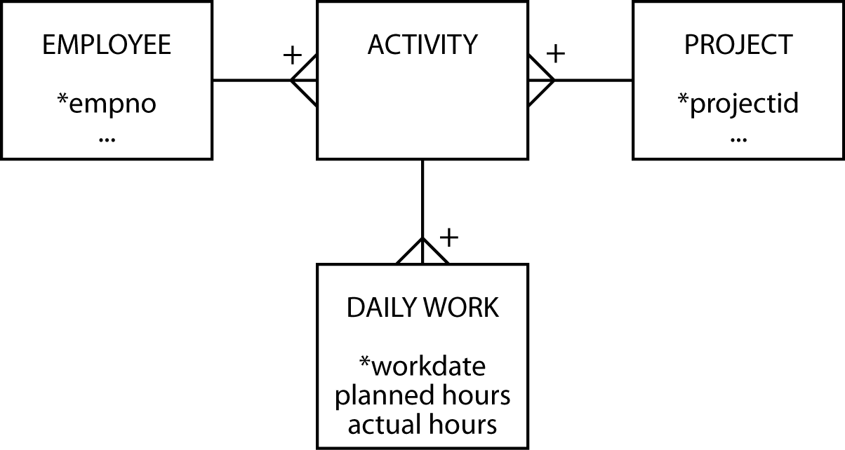 You already have the tools for modeling temporal values. For example, the project management data model discussed in Chapter 7 and reproduced in the following figure contains temporal data.