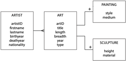 A comma-separated values (CSV) file85 is a common form of text file because most spreadsheet programs offer it as an export option. There are a variety of options available in terms of the separator for fields (usually a comma or tab) and the use of quotation marks to denote text fields. Usually, each record has the same number of fields. Frequently, the first record contains names for each of the fields. Notice in the example file that follows that a record contains details of an artist and one piece of that person’s art. As the data model specifies, these two sets of data go into separate tables.